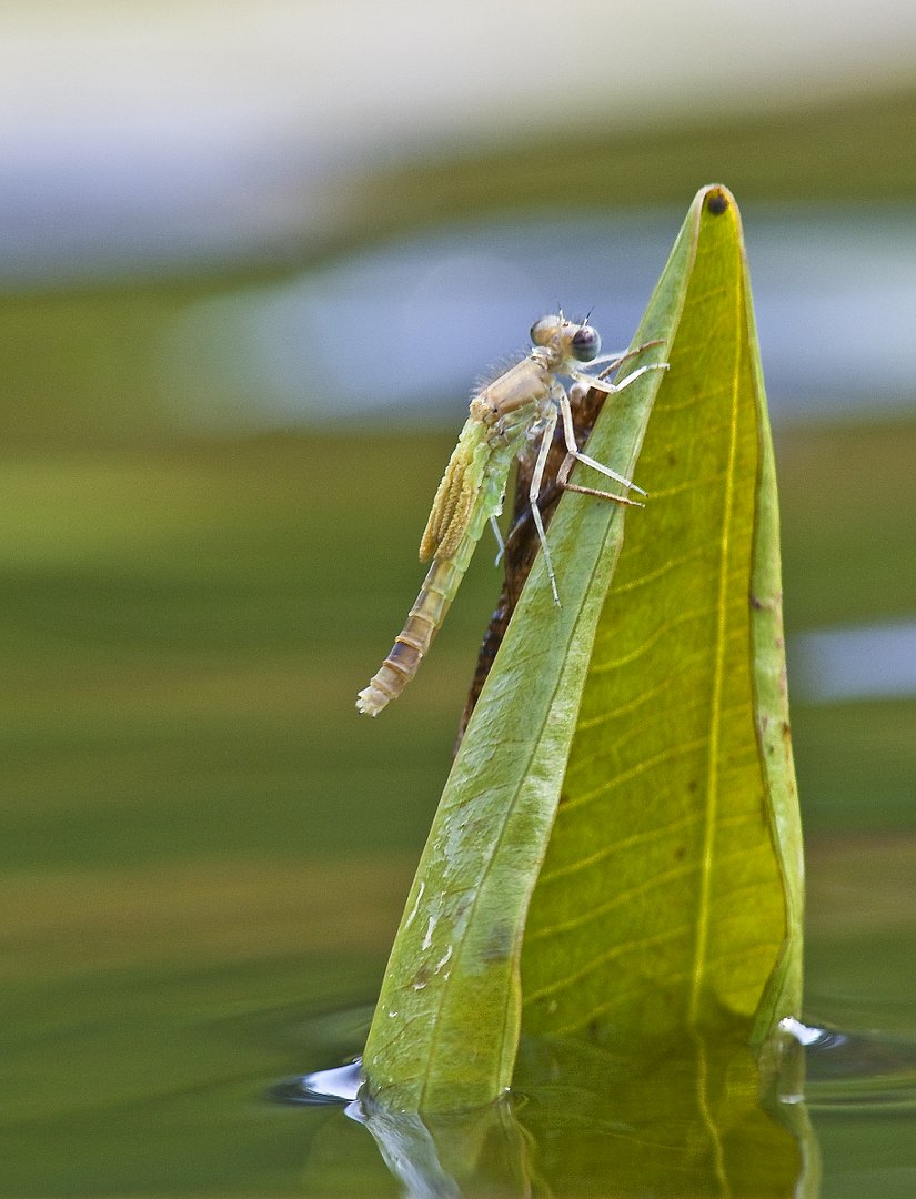 Leuk om te zien hoe het water door de oppervlakte spanning indeukt onder de legbuis van het juffertje